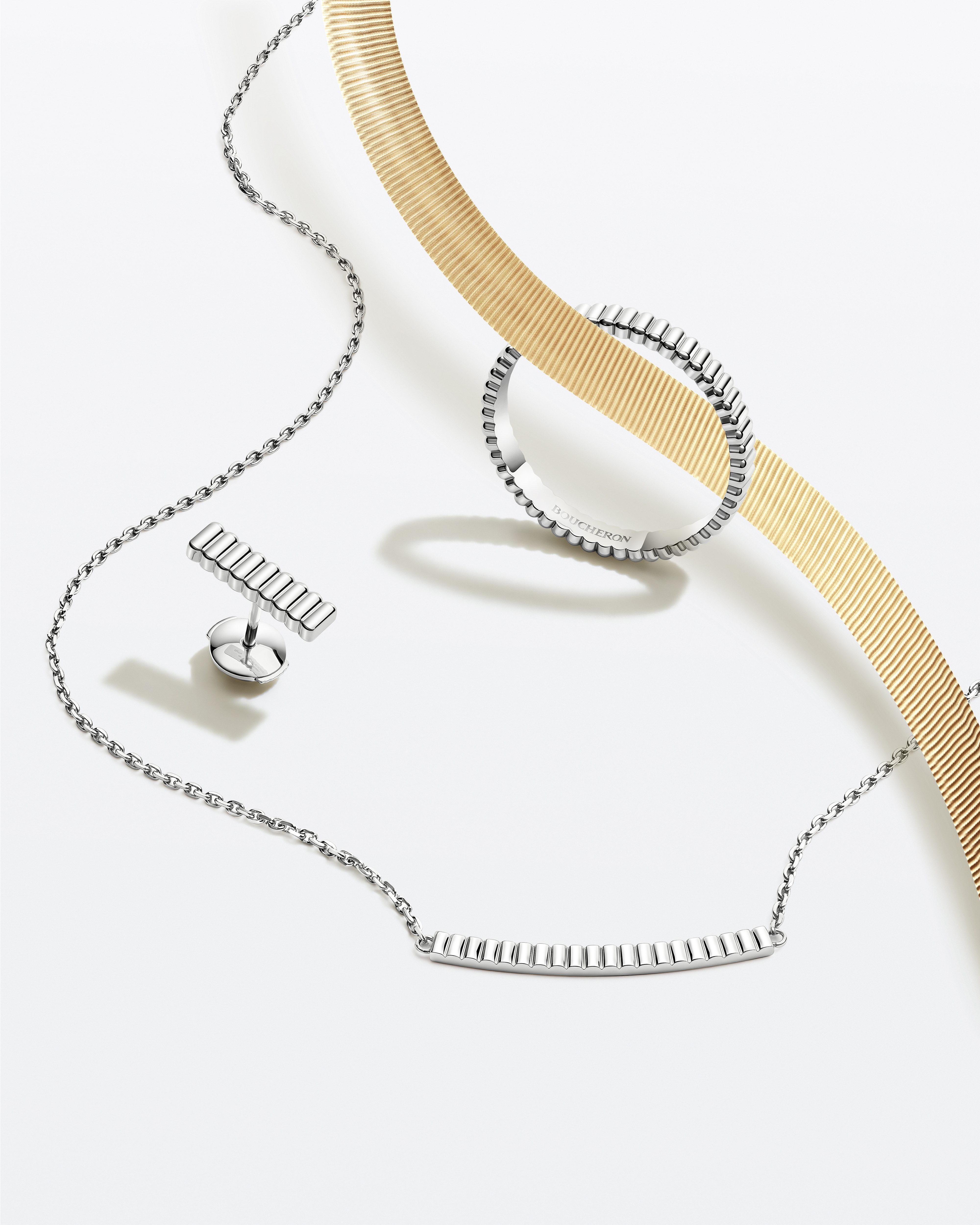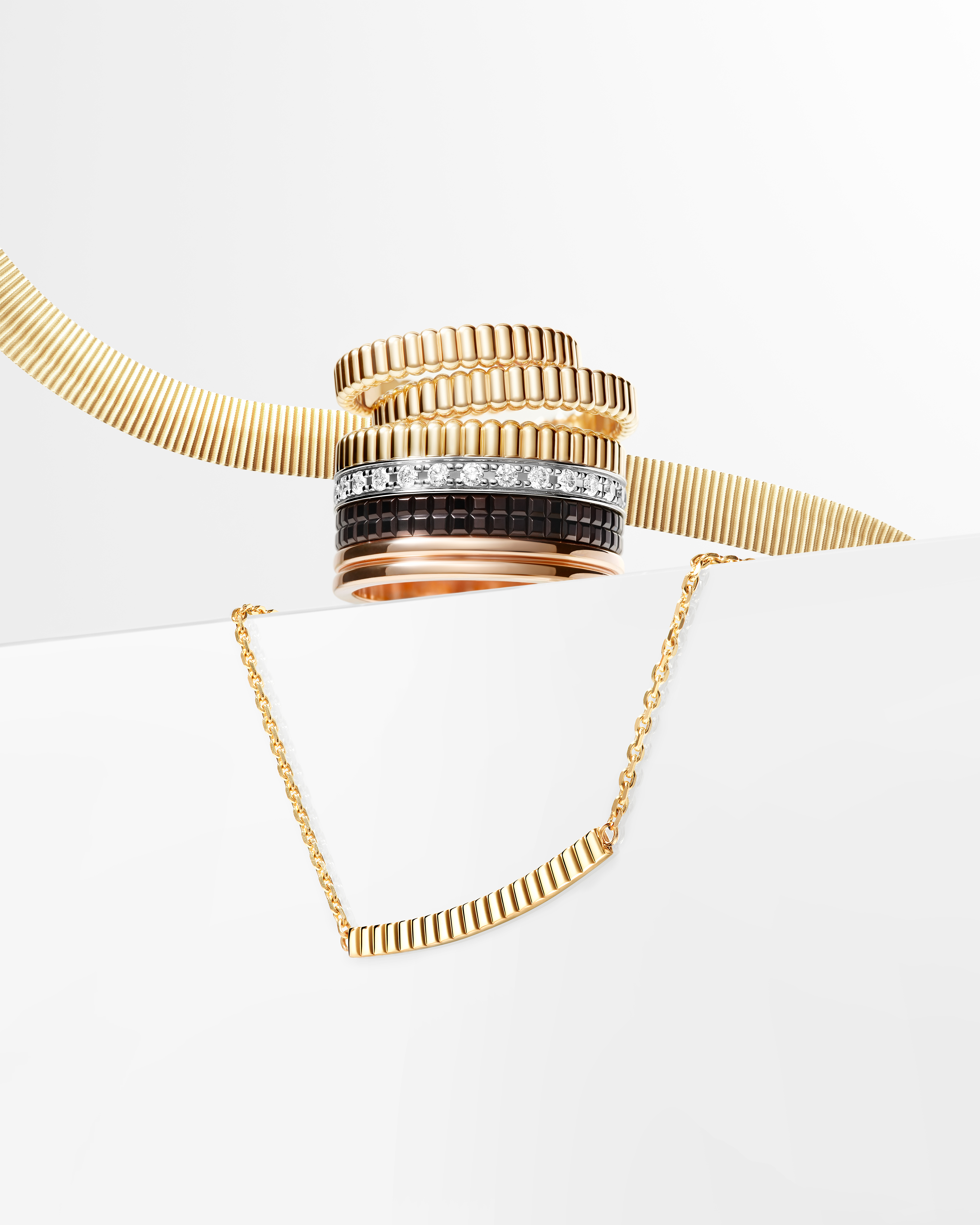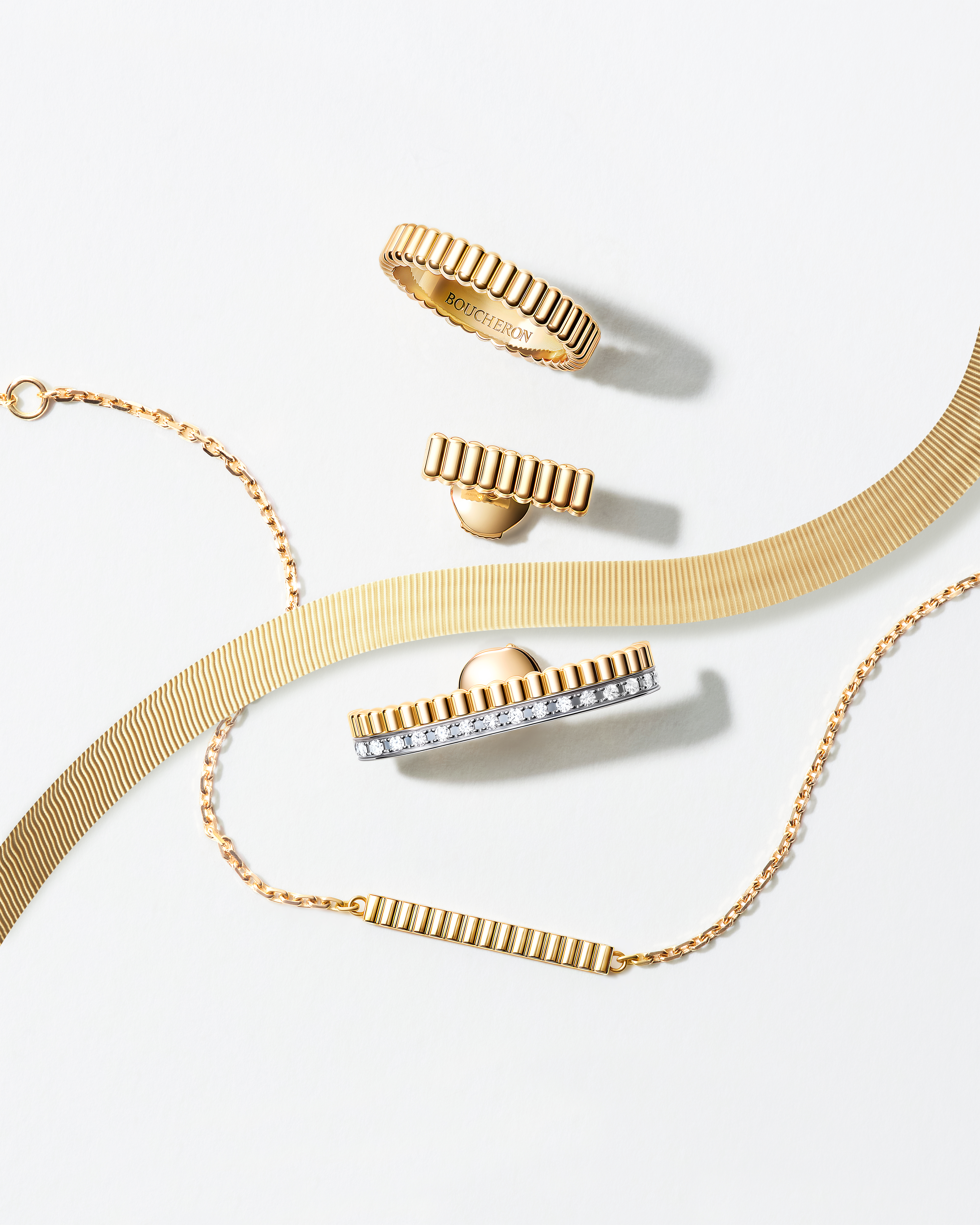 Behind Quatre’s modern design lie four iconic codes drawn from the Boucheron archives. Each pays tribute to a chapter in the Maison’s history, and the Grosgrain motif, in particular, is a nod to its founder. Grosgrain was originally a ribbed silk fabric, often used to make ribbons. This code has been in Boucheron’s archives since the 1860s. Its origin can be traced to Frédéric Boucheron’s father, who was a draper. The Grosgrain code recalls the couture heritage that helped make Boucheron’s name, with jewelry famed for being as supple and delicate as precious fabrics.