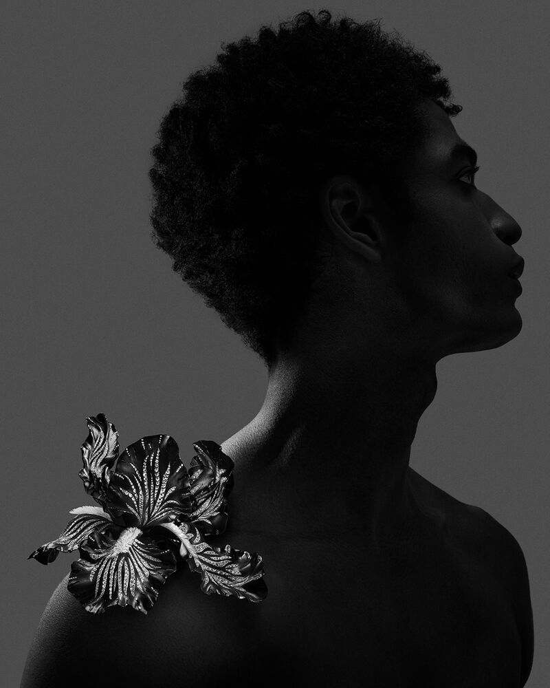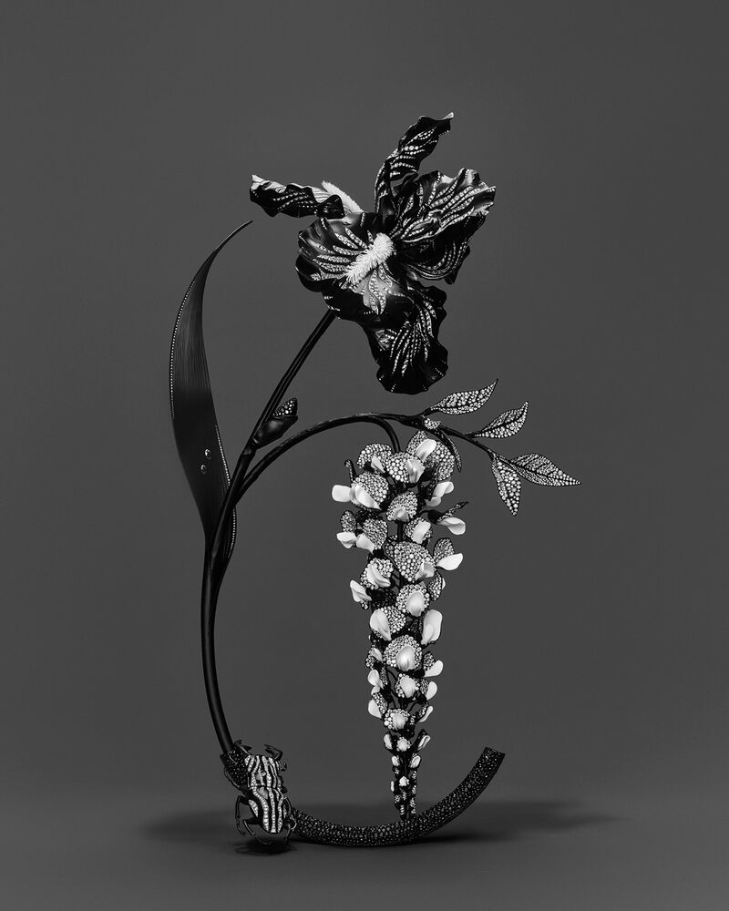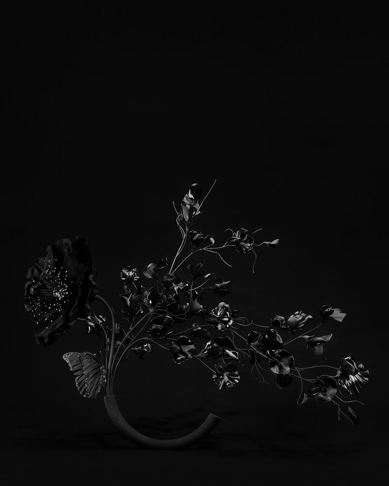 虞美人的制作体现此系列的一大重要创新:其花瓣内侧以哑光黑色钛金属手工雕刻而成,并涂覆Vantablack®,呈现出极为深邃的黑色。花心部分镶嵌黑色尖晶石,或正或反,错落有致。豌豆花舒展出点缀黑色尖晶石的钛金属花茎。其花朵以黑色砂金玻璃与缟玛瑙精心雕刻而成,尽显花瓣娇柔美态。在一片幽邃之中,一只蝴蝶若隐若现。蝶身由哑光黑色钛金属打造,镶嵌黑色尖晶石,双翼采用专门研发的黑色透明玻璃制成,呈现出通透质感。整组作品置于由黑色砂石3D打印而成的花瓶重。