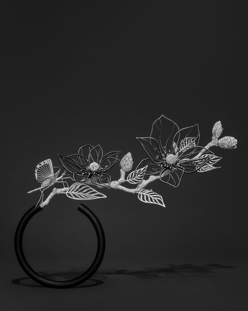 在此组作品中,宝诗龙通过如幻似真的木兰花,巧妙探索光与影的边界,花朵仅留骨架轮廓。用极为轻盈的铝材质打造花枝,不仅解决重量问题,更赋予其耀目的莹白光泽。花瓣由黑色阳极氧化铝制成,得益于其线性铺排的齐平镶嵌设计,闪耀夺目,熠熠生辉。花蕊采用白金材质,打破传统,花朵白金花蕊中的钻石采用倒置镶嵌工艺,营造出令人意想不到的光影效果。一只竹节虫在这片光影交错的世界中悠然穿行。竹节虫以白金打造,身体与翅膀点缀钻石。整组作品静置于哑光黑色复合材质的花樽之上。