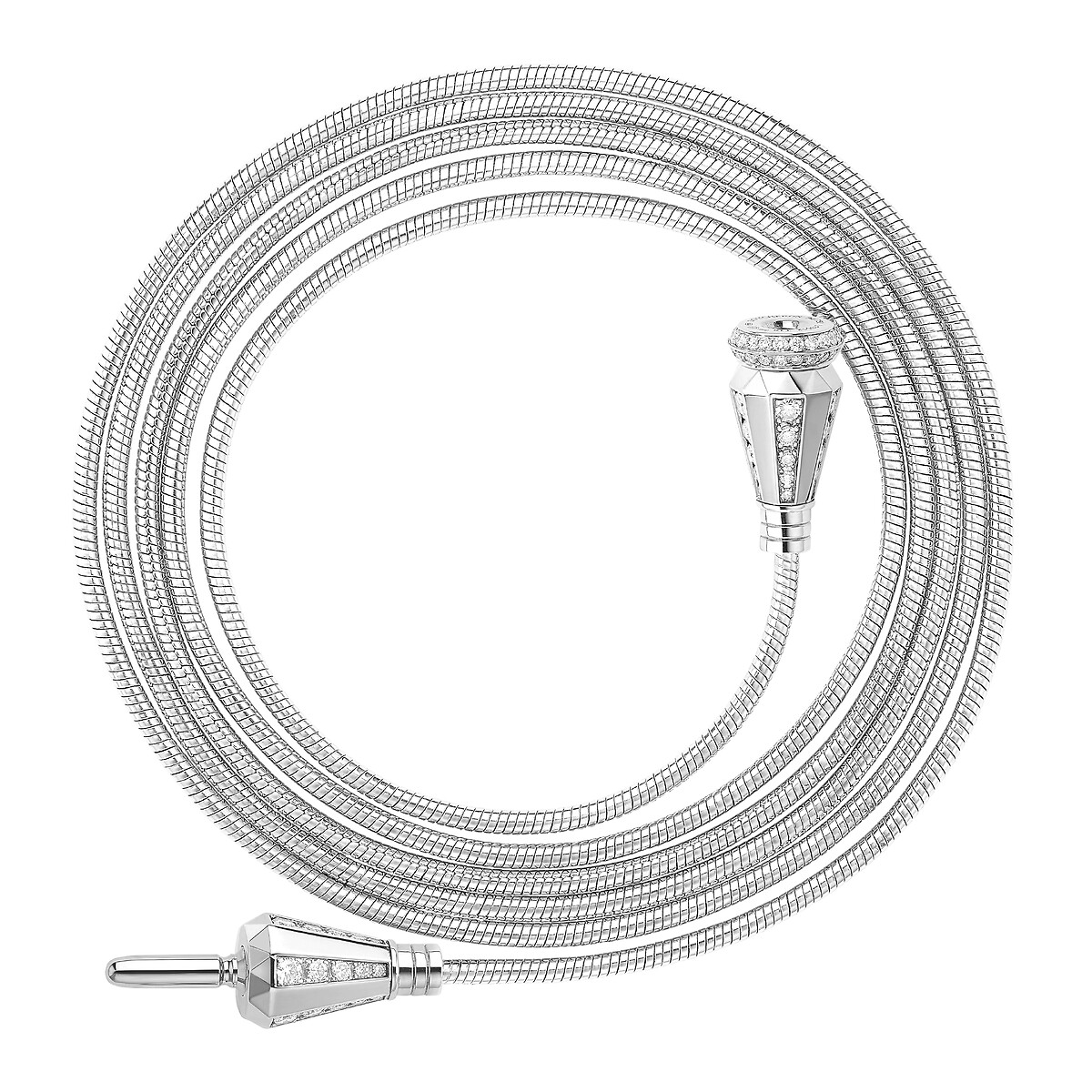 Jack系列快乐自在,反叛不羁,重新定义珠宝佩戴方式,为Boucheron宝诗龙打开了品牌历史的全新篇章。极具造型感的环扣巧妙借鉴电线插孔原理,采用隐秘式设计,适合丰富多变的佩戴方式。这款作品是以白金材质打造、镶嵌钻石的六圈链环。