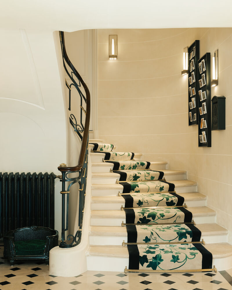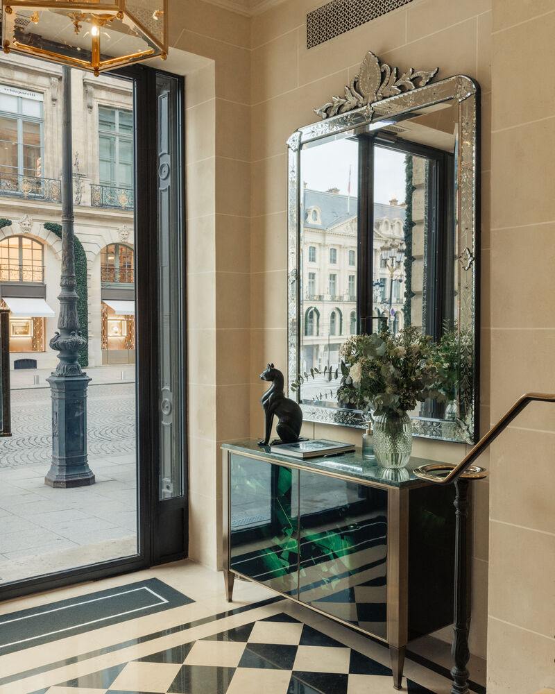 我们仿佛依然能够听到卡斯堤里安伯爵夫人(Castiglione)翩然步入Nocé公馆的脚步声。这座历史悠久的入口设立于和平街一侧,依然保留着当年的凸圆形装饰和棋盘格图案石材。作为品牌高级珠宝的象征,分枝吊灯与立于其上的水晶小鸟与Boucheron宝诗龙宠猫Wladimir相映成趣。