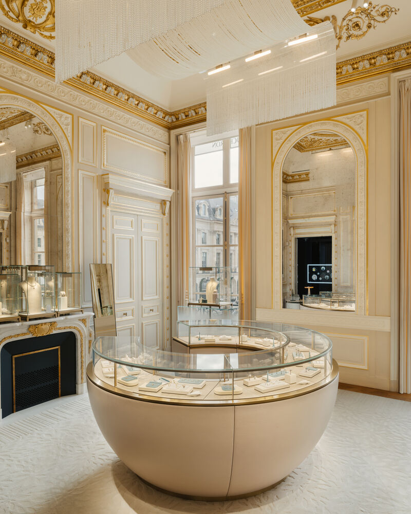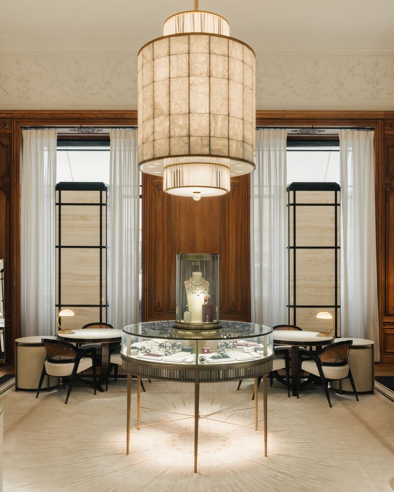 为了呈现高级珠宝作品的璀璨美感,光线扮演着至关重要的角色。Salon des Lumières宛如令珠宝绽放耀眼光芒的专属珠宝盒。展示橱窗低调隐匿,映衬着珠宝耀眼的光芒,透过房间窗户则可俯瞰芳登广场的美丽景色。