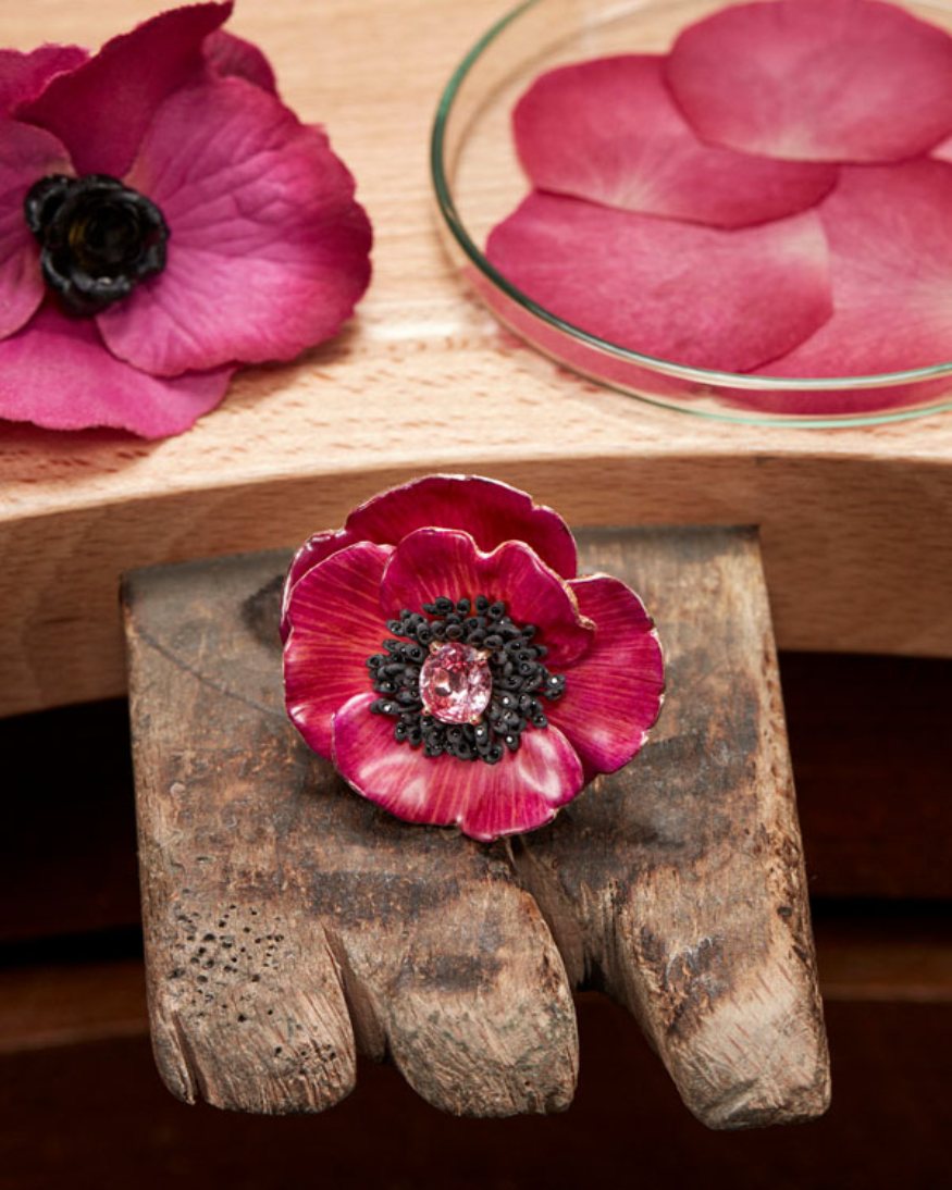 将鲜花转瞬即逝的美感 升华为永恒作品。定格珍贵时光。这正是Claire Choisne创作Fleurs Éternelles永生花系列戒指时的梦想。Boucheron宝诗龙历经数年研发,最终利用先进技术,在不使用颜料或化学物质的条件下保持花瓣的娇嫩质感和天然光泽。随后,Boucheron宝诗龙对花朵逐一进行数码扫描,捕捉细致入微的立体形态,从而打造钛金属结构,用以组装经过永生处理的花瓣。在此,大自然得以重新焕发盎然生机。这是Boucheron宝诗龙所独有的先进工艺。