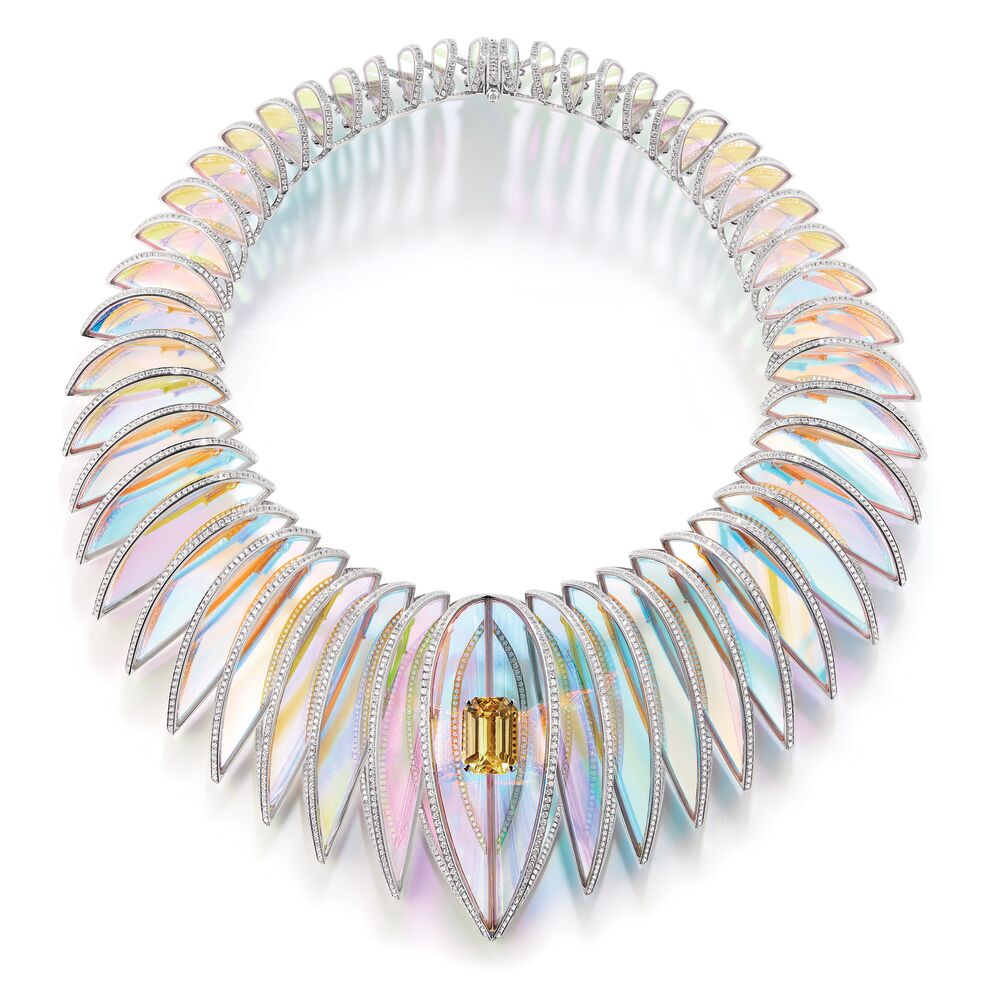 Claire Choisne演绎奇思创想,于颈间呈现天空之境。事实上,Goutte de Ciel项链的制作过程极为精妙复杂。Boucheron宝诗龙以轻盈通透的气凝胶再现天空变幻莫测的色彩。气凝胶是美国国家航空航天局(NASA)用来捕捉太空星尘的一种材料。这种富有传奇色彩的材料由99.8%的空气和二氧化硅组成,Boucheron宝诗龙工匠以其包裹一颗水晶,从而随着光线摇曳而变换色彩。