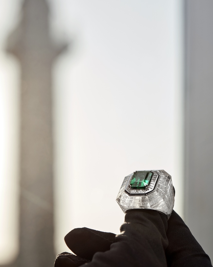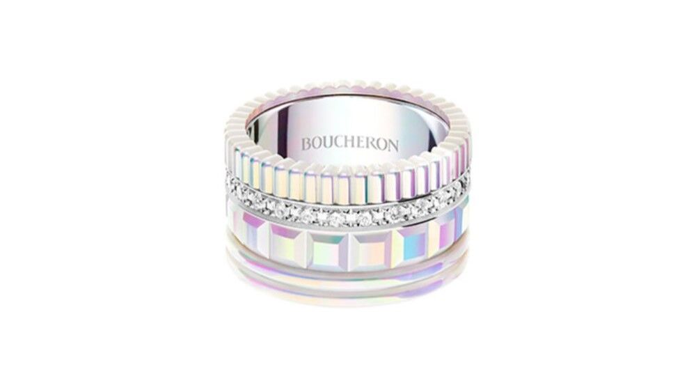 创新,亦体现在将原本与高级珠宝世界毫无共同之处的合作伙伴团结在一起。2021年,Boucheron宝诗龙与Saint-Gobain携手合作。这家创立于1665年的法国企业,擅长生产各种玻璃工艺制品。此次合作的成果,是研发出一种全息镀层,可喷洒于陶瓷表面,并覆盖十多层,在Quatre系列和Jack de Boucheron系列作品上巧妙玩味绮丽绚烂的色彩变幻。
