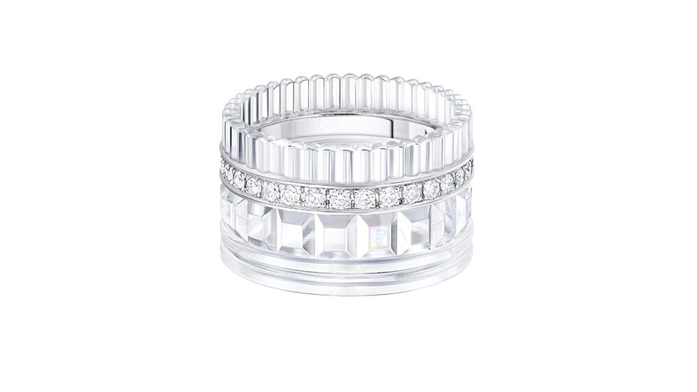 Boucheron宝诗龙于2024年欣然揭晓“Quatre 5D Memory概念款戒指”,以尖端技术实现灵动创意与美学艺术。如何将声学作品融入Quatre系列戒指之中? 这要归功于一项名为“5D memory”的光学数据存储技术。这项超高速纳米结构技术由南安普顿大学教授兼SPhotonix首席科学官彼得·卡赞斯基(Peter Kazansky)发明,并首次被高级珠宝世家使用。该技术可在纳米结构玻璃(即纳米级别微观分子组成的玻璃)中储存海量信息,并稳定保存长达数十亿年之久。为了实现这一壮举,Boucheron宝诗龙还采用了同样先进的Glassomer®技术。除了镶嵌于白金材质的一排钻石外,Quatre系列戒指的其他元素均被悉心雕刻其上。法国蓬皮杜声学与音乐研究中心研发的声音作品**,则存储于其中一枚巴黎饰纹(Clou de Paris)图案的中央。