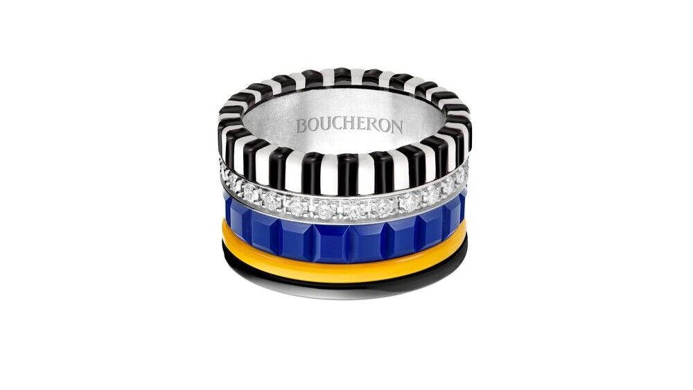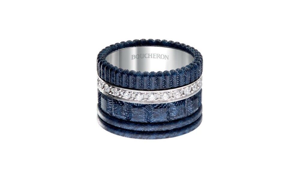 2020年,Boucheron宝诗龙推出了两款牛仔蓝色作品,分别为一枚Quatre系列戒指和一枚Quatre系列手镯。Claire Choisne也因此升华牛仔布料,将其与白金和钻石相互搭配。得益于世家研发部门所掌握的精湛专业技艺,一种特殊的合金也应运而生。