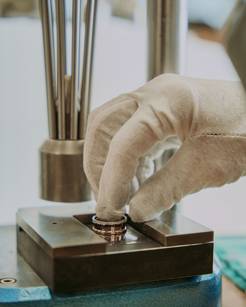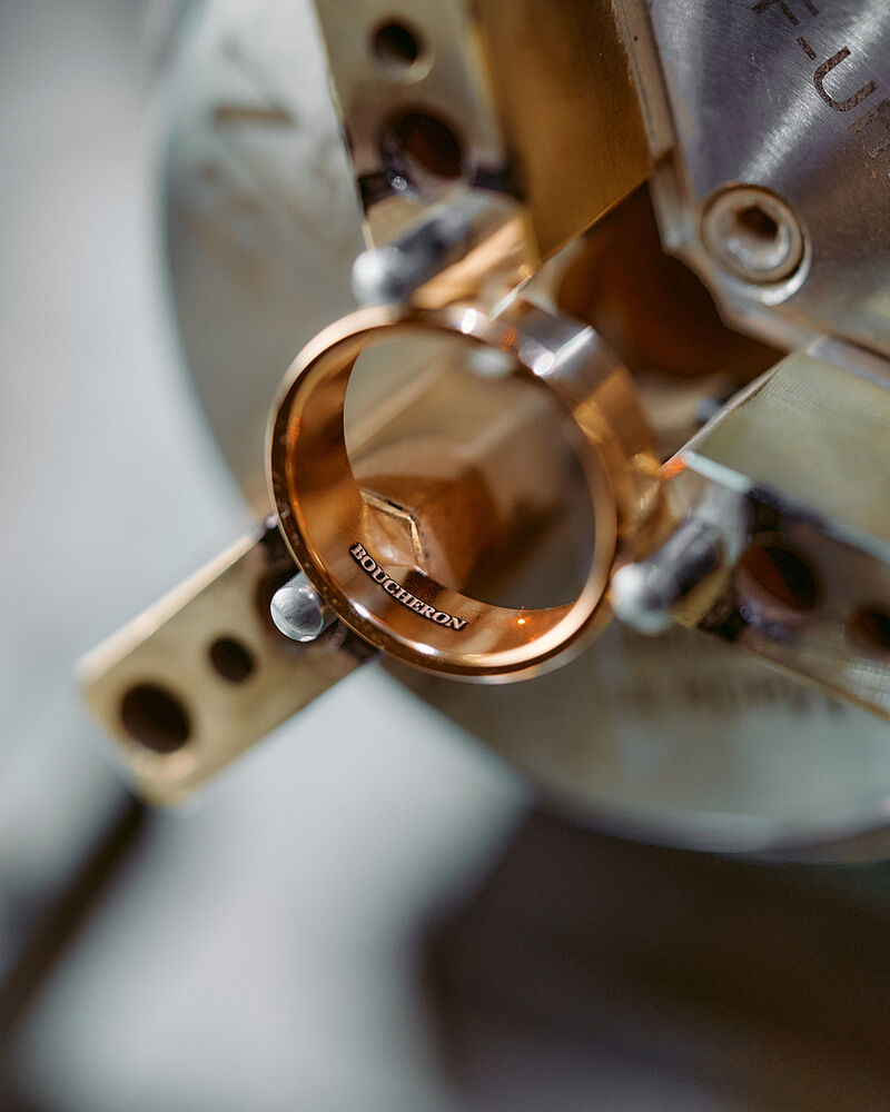 在此系列中,尖端技术为传统珠宝工艺服务,两者相辅相成,而非取而代之。在Quatre戒指的制作过程中,数控机床负责完成无法以手工操作、误差需精确至毫厘的工序,例如戒圈外侧和内侧整型的车削和金雕工序。