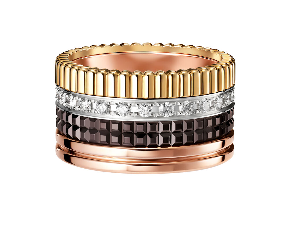 每一款经典设计元素,皆融汇精湛传统工艺与尖端科技,由工艺大师悉心雕琢、臻于细节。Quatre戒指独具魅力。它由四枚截然不同的环圈组成,每枚环圈皆独立制作,再巧妙合为一体,彰显Boucheron宝诗龙独树一帜的美学魅力。