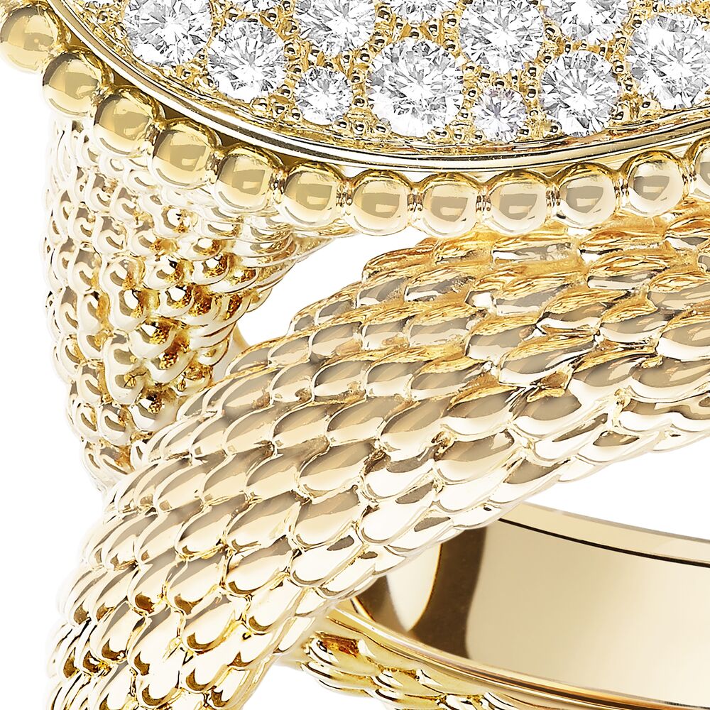 经过悉心雕琢的金质,令人想起灵蛇鳞片。世家工艺大师运用精巧工具对金属加以精心锤锻,从而呈现栩栩如生的质感。这项工艺极其精细,尽显Boucheron宝诗龙的过人造诣。