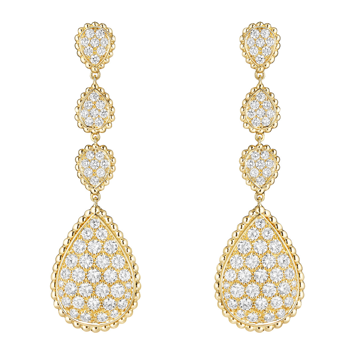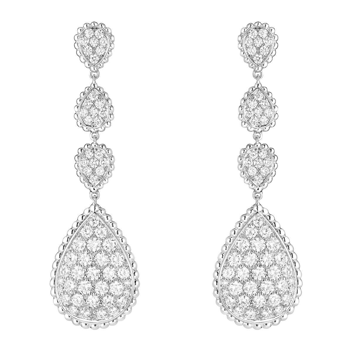 这款Serpent Bohème白金镶钻吊坠耳环沿袭七十年代的波希米亚风格。古香古色而又隽永典雅,Serpent Bohème令您彰显柔美魅力。