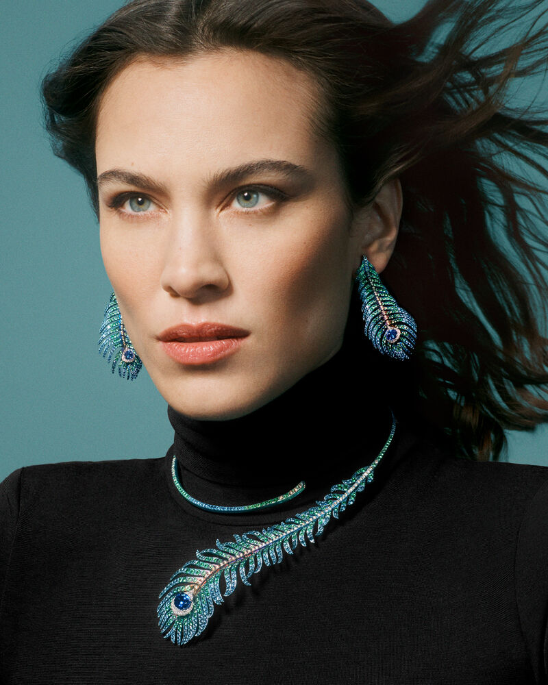 Boucheron宝诗龙焕新演绎彰显世家自然主题的标志性Plume de Paon孔雀羽毛图案,采用较黄金轻盈3倍的钛金属生动呈现轻盈的美感。钛金属羽枝镶嵌钻石、蓝宝石、坦桑石和沙弗莱石,营造出蓝绿色光芒的渐变效果,再现灵动羽毛随风摇曳的优美姿态。