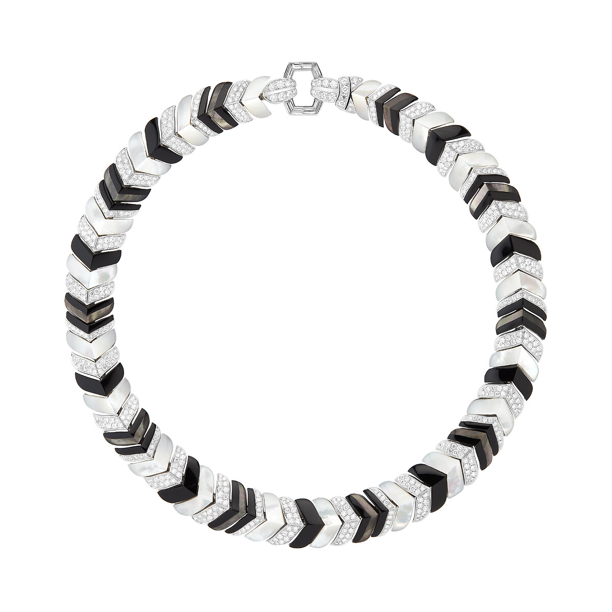 Vendôme Argentique项链全新演绎装饰艺术时期的经典人字斜纹图案。缟玛瑙和珍珠母贝款式跳脱古典藩篱,彰显大胆而不失优雅的风范。