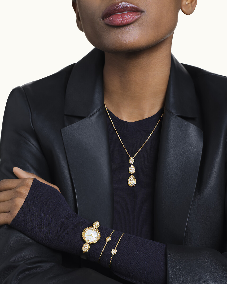 该腕表系列采用品牌标志性Serpent Bohème图案。 作品采用精细金艺,演绎感性柔美的女性特质。 图案经过精雕细刻和悉心抛光,理想衬托钻石的光华。